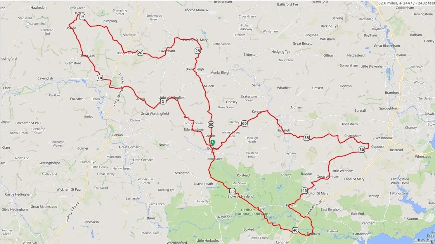 31\32 Mile Route - Participants wishing to ride only one loop will have the option of riding either loop 1 or 2. Loop 1 takes you west through the historiic villages of Long Melford and Lavenham or route 2 takes you into the heart of Constable Country through the village of Dedham and the historic market town of Hadleigh.