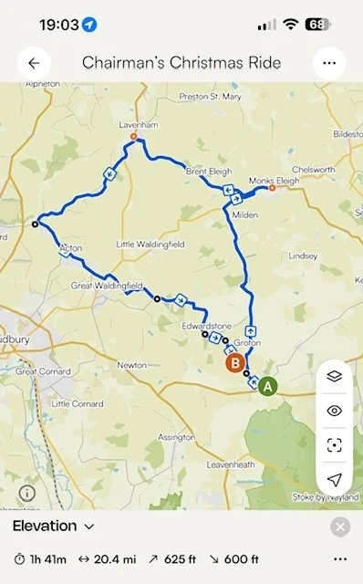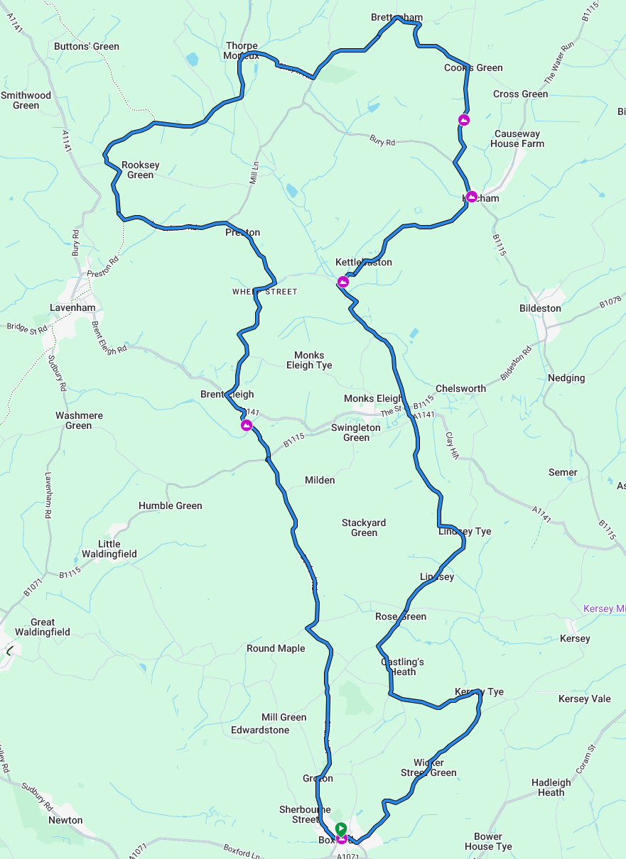 Sunday morning bike club ride designed by David H. Pleasant ride around the Boxford area. Plenty of cafe stops in Lavenham as well.